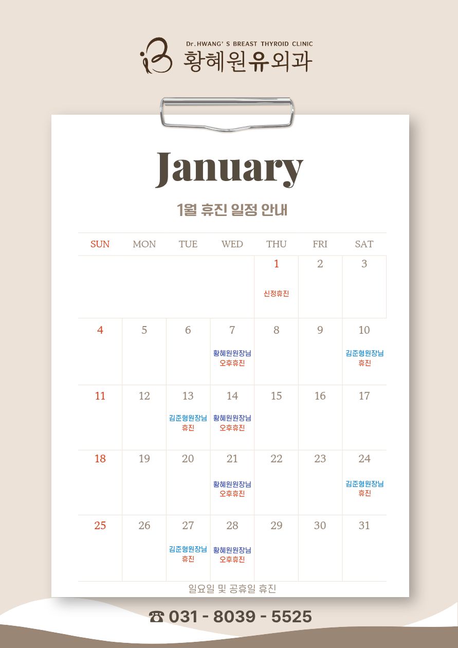 병원소개 진료안내 전문클리닉 원내알림 병원소개 인사말 의료진 의료장비소개 둘러보기 진료안내 오시는길 진료안내 가상진료체험 상담예약 진료비안내 의무기록신청 전문클리닉 유방클리닉 갑상선클리닉 원내알림 공지사항 유외과활동 031.8039.5525 Dr.Hwang’s Breast Thyroid Clinic 원내알림 공지사항 공지사항 유외과활동 공지사항 2025.12.23 2026년 1월 진료일정 안내 <2026년 1월 진료 일정 안내> 목록 진료시간 진료예약 오시는 길 Top