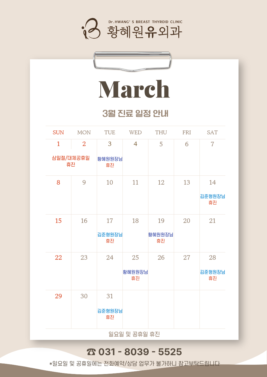병원소개 진료안내 전문클리닉 원내알림 병원소개 인사말 의료진 의료장비소개 둘러보기 진료안내 오시는길 진료안내 가상진료체험 상담예약 진료비안내 의무기록신청 전문클리닉 유방클리닉 갑상선클리닉 원내알림 공지사항 유외과활동 031.8039.5525 Dr.Hwang’s Breast Thyroid Clinic 원내알림 공지사항 공지사항 유외과활동 공지사항 2026.02.26 3월 진료일정안내 목록 진료시간 진료예약 오시는 길 Top