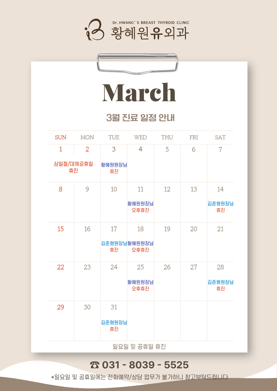 병원소개 진료안내 전문클리닉 원내알림 병원소개 인사말 의료진 의료장비소개 둘러보기 진료안내 오시는길 진료안내 가상진료체험 상담예약 진료비안내 의무기록신청 전문클리닉 유방클리닉 갑상선클리닉 원내알림 공지사항 유외과활동 031.8039.5525 Dr.Hwang’s Breast Thyroid Clinic 원내알림 공지사항 공지사항 유외과활동 공지사항 2026.02.23 3월 진료일정안내 목록 진료시간 진료예약 오시는 길 Top